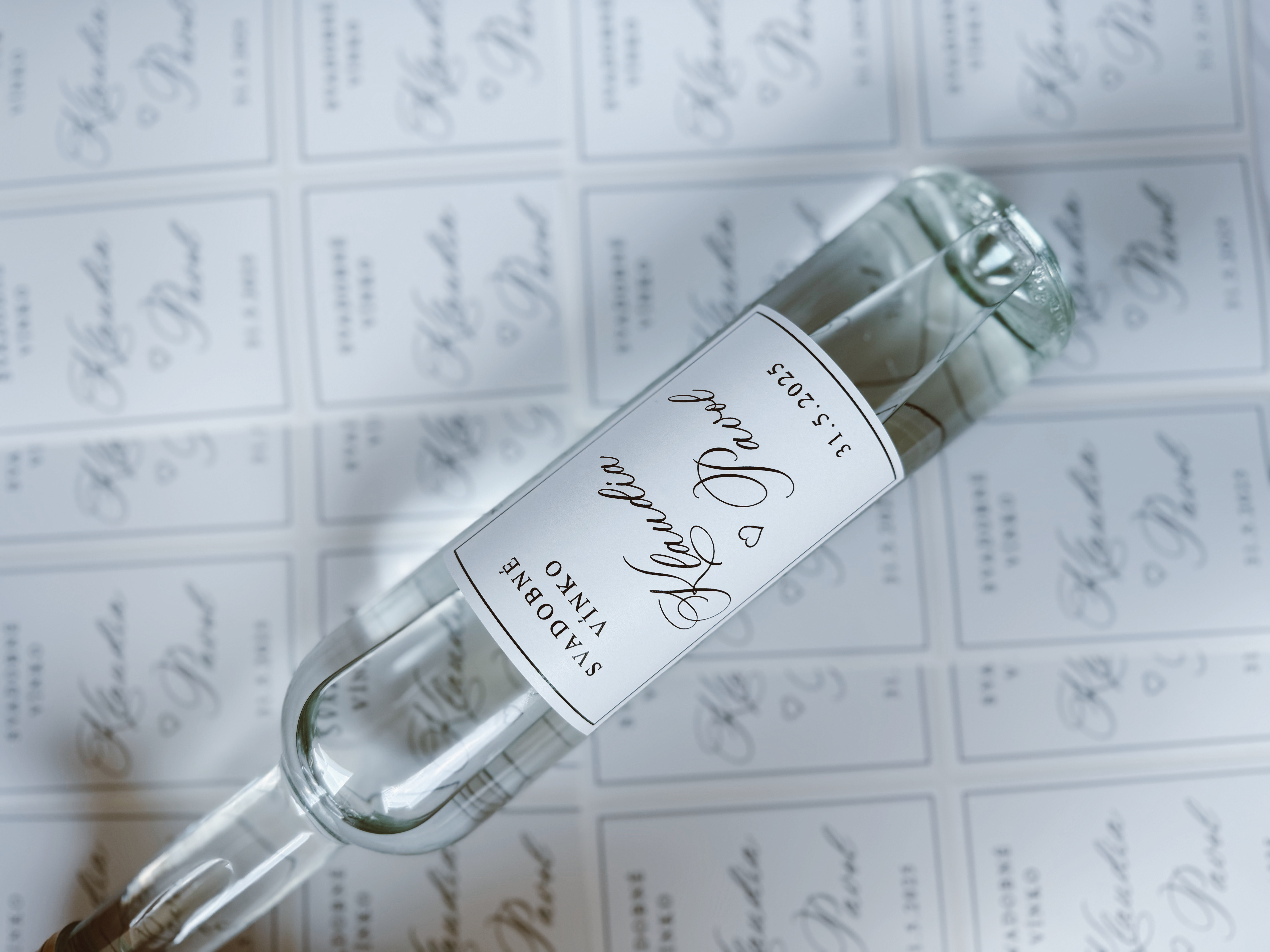 Štýlové svadobné etikety na fľaše, ktoré dodajú vašej svadobnej pálenke či vínu elegantný a osobný dotyk. Možnosť personalizácie s menami novomanželov, dátumom svadby a vlastným textom. Perfektné ako darček pre hostí alebo na svadobný stôl.